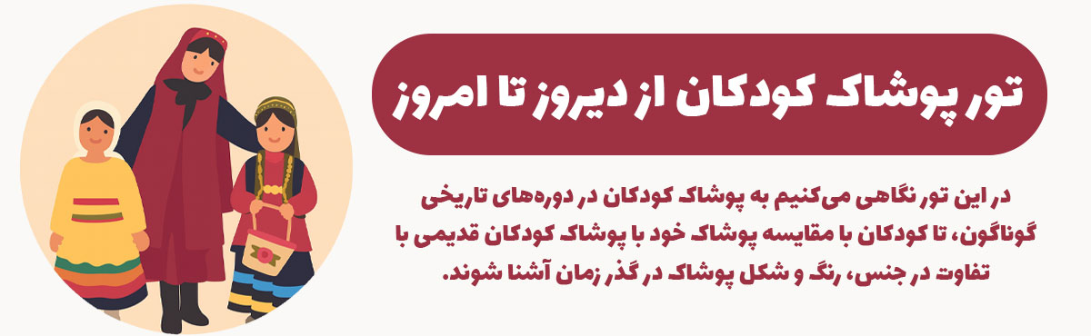در این تور نگاهی میکنیم به پوشاک کودکان در دورههای تاریخی گوناگون، تا کودکان با مقایسه پوشاک خود با پوشاک کودکان قدیمی با تفاوت در جنس، رنگ و شکل پوشاک در گذر زمان آشنا شوند.