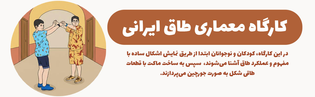 در این کارگاه، ابتدا از طریق نمایش اشکال ساده با مفهوم و عملکرد طاق آشنا می‌شویم و مروری بر بناهای معماری که فرم طاق در آنها عنصر شاخصی است، می‌کنیم. در ادامه سری به ویترین مینیاتورها می‌زنیم و به جست‌وجوی طاق‌ها و ترکیب‌بندی آنها می‌پردازیم و کودکان و نوجوانان از تجربیات خود در این خصوص می‌گویند.