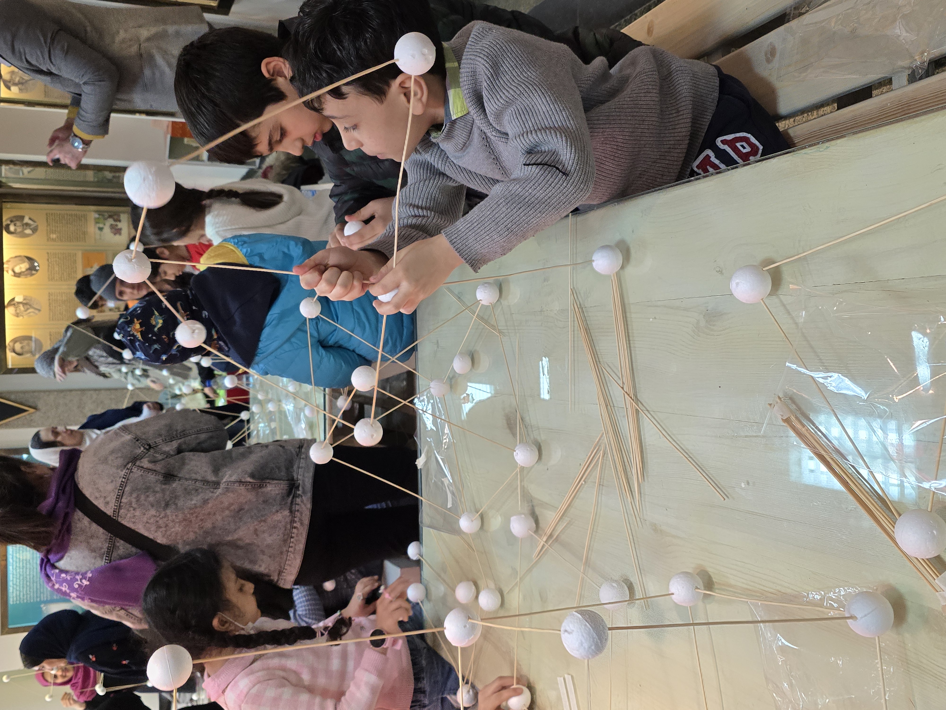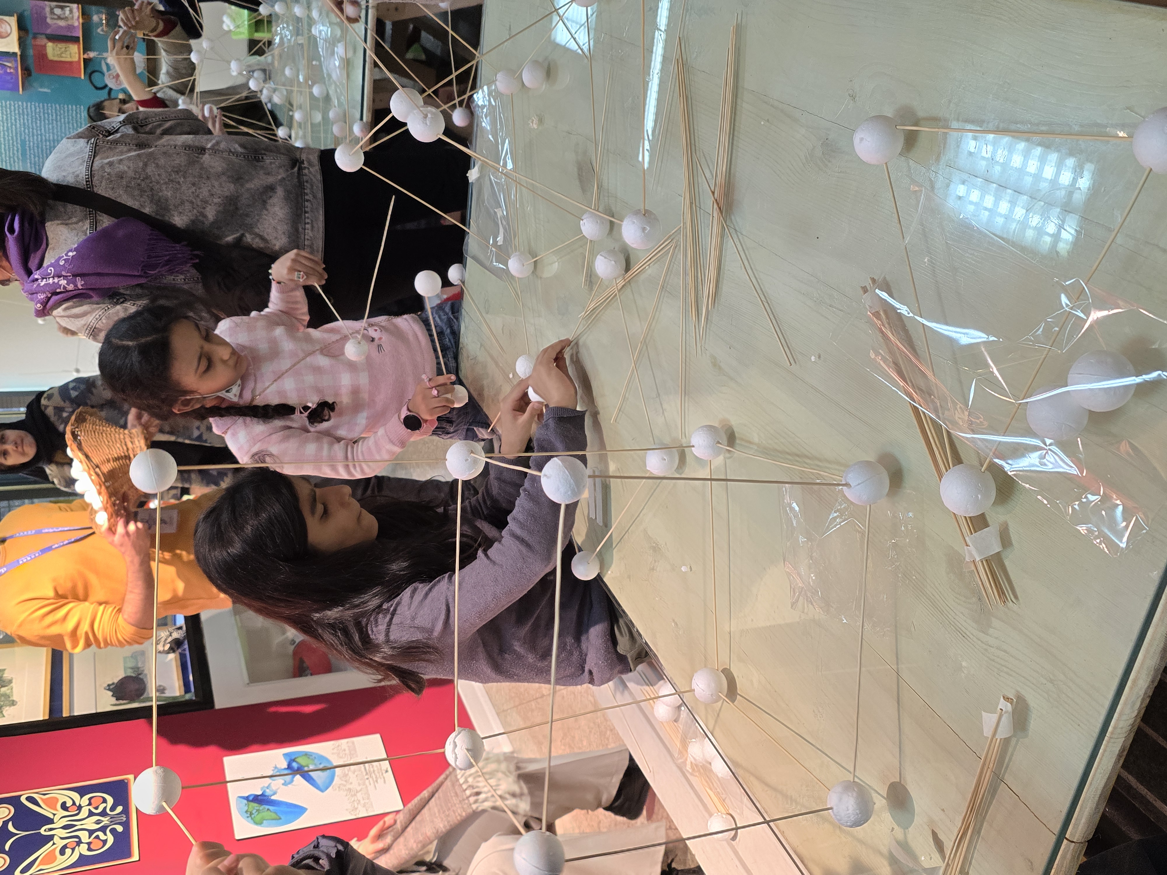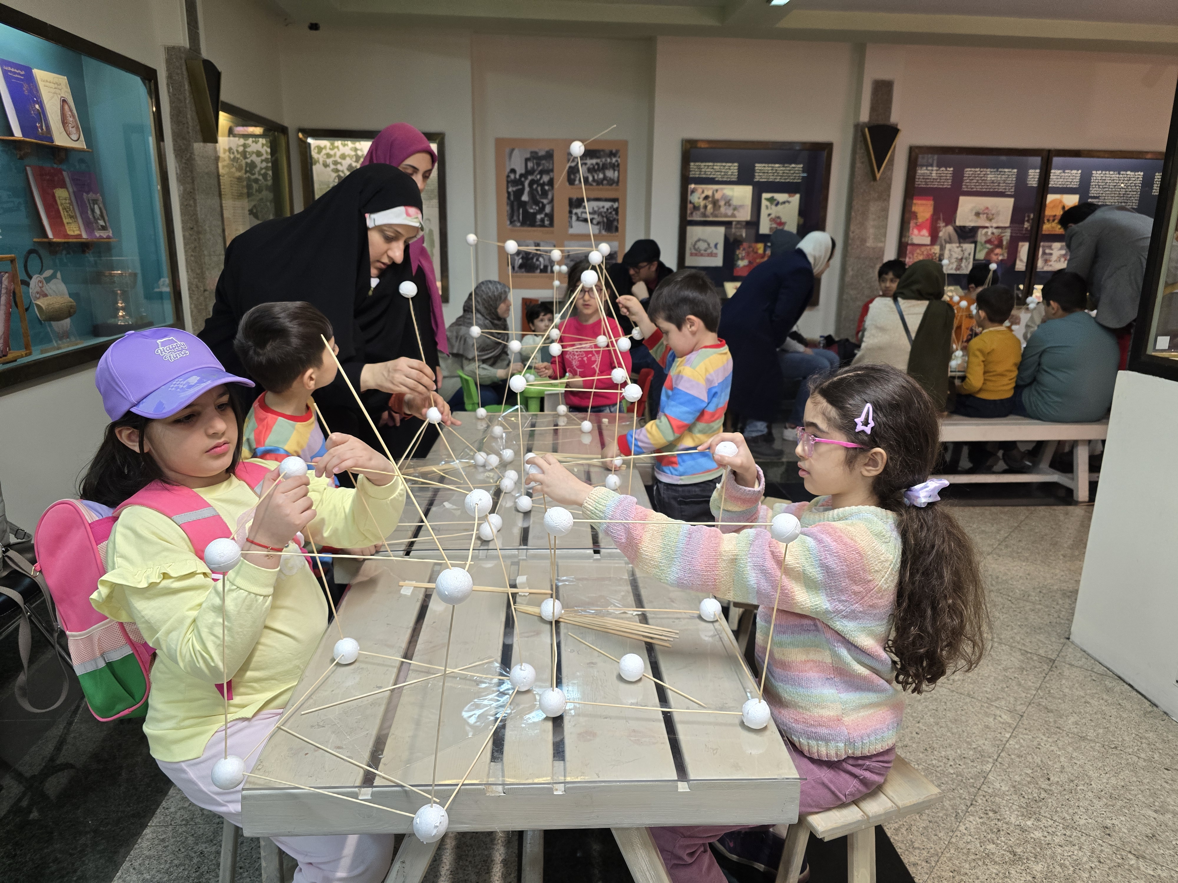 در این کارگاه به دنبال آشنایی کودکان و نوجوانان با اشکال هندسی هستیم. با آنها از نقطه، خط و سطح صحبت می‌کنیم. در ادامه به همراه یکدیگر در موزه قدم می‌زنیم و درباره اشکال مختلفی که می‌بینیم و اجزای تشکیل‌دهنده آن‌ها گفتگو می‌کنیم. در ادامه با کمک گوی‌های یونولیتی و میله‌های چوبی کودکان و نوجوانان این فرصت را می‌یابند که با نقطه و خط به ساخت اشکال هندسی مختلف بپردازند. دست‌ساخت آن‌ها در کنار هم چیدمانی را شکل می‌دهد که کودکان و نوجوانان می‌توانند از طریق آن تجربه‌ی فضایی به دست آورند. این نوع کارگاه‌ها فرصتی برای تعامل و ارتباط بیشتر کودکان و نوجوانان بایکدیگر و همچنین با والدینشان است به‌طوریکه می‌تواند به تجربه‌ی بازی گروهی تبدیل شود. تجربه این مفاهیم از طریق ساخت ماکت قابل گسترش هم امکان‌پذیر است که در دست‌ورزی و پرورش تجسم فضایی کودکان موثر است.