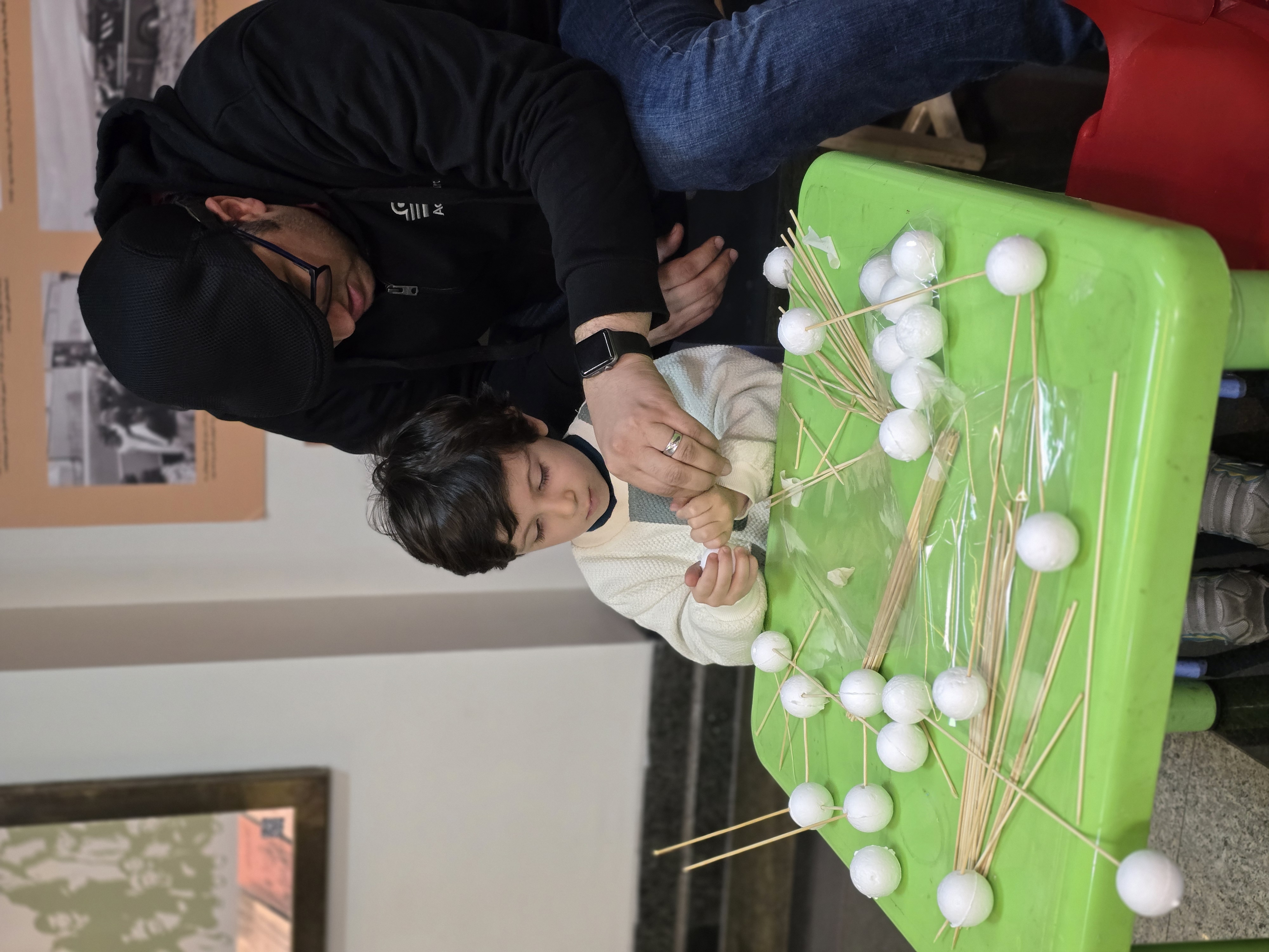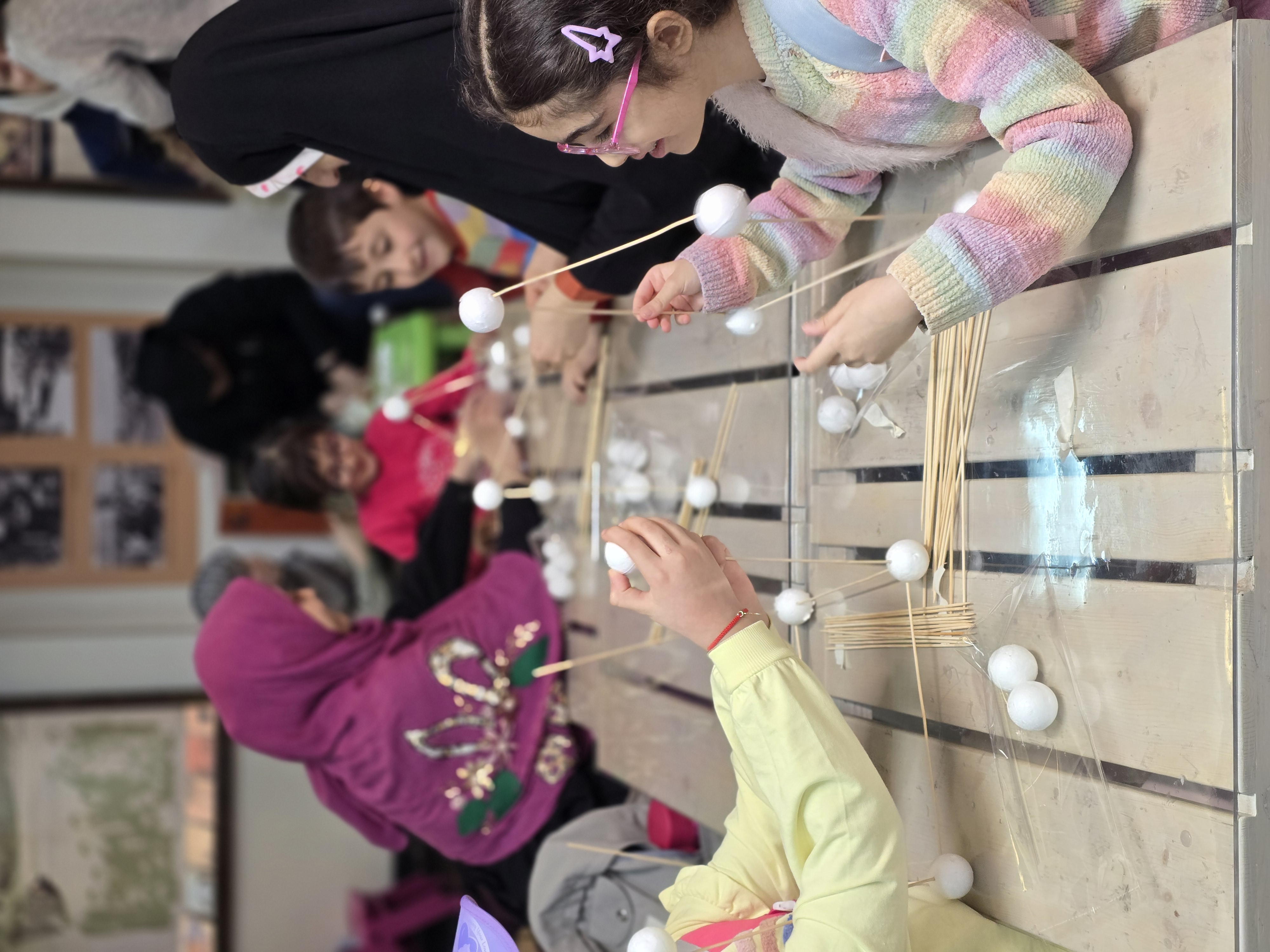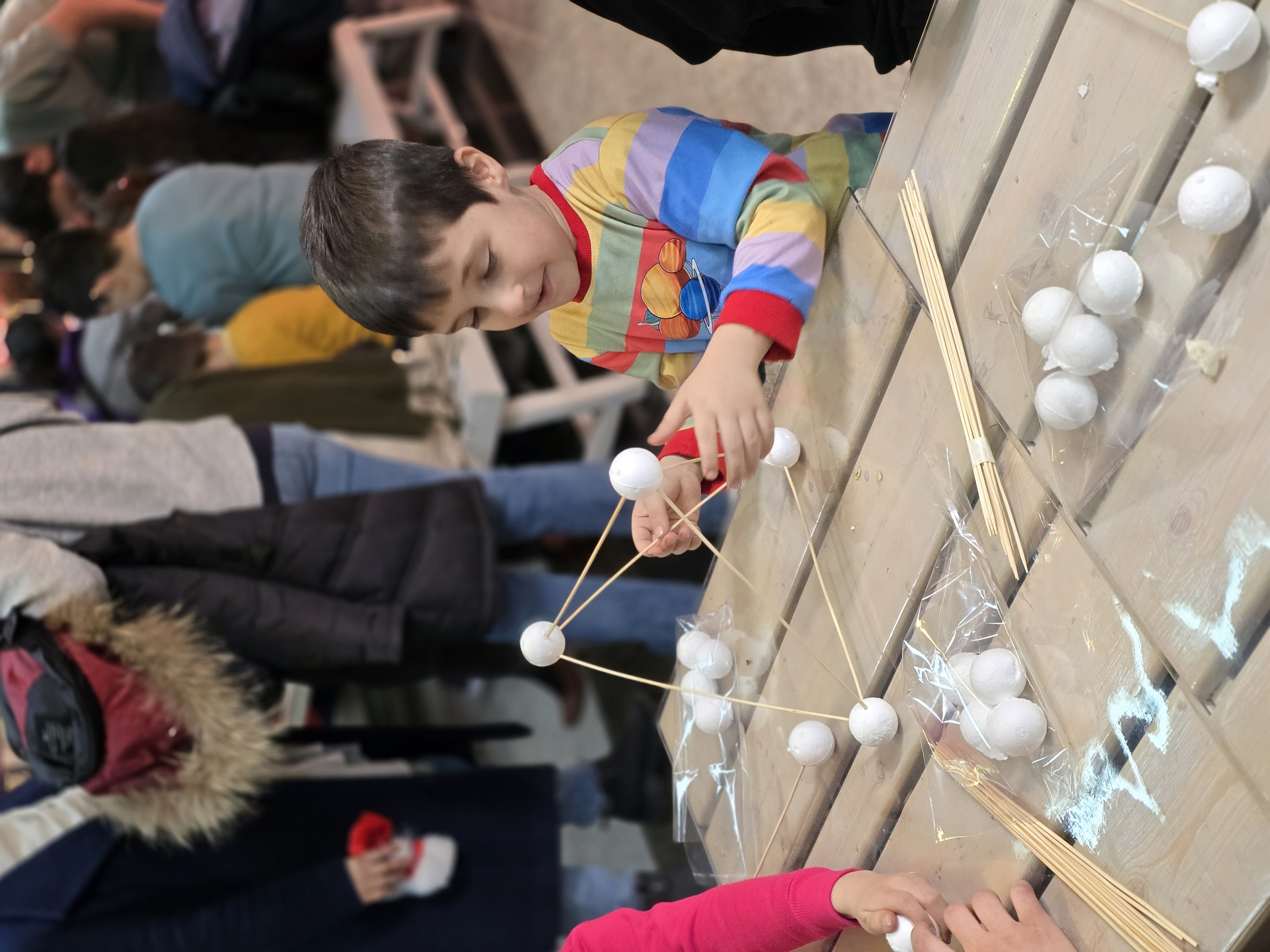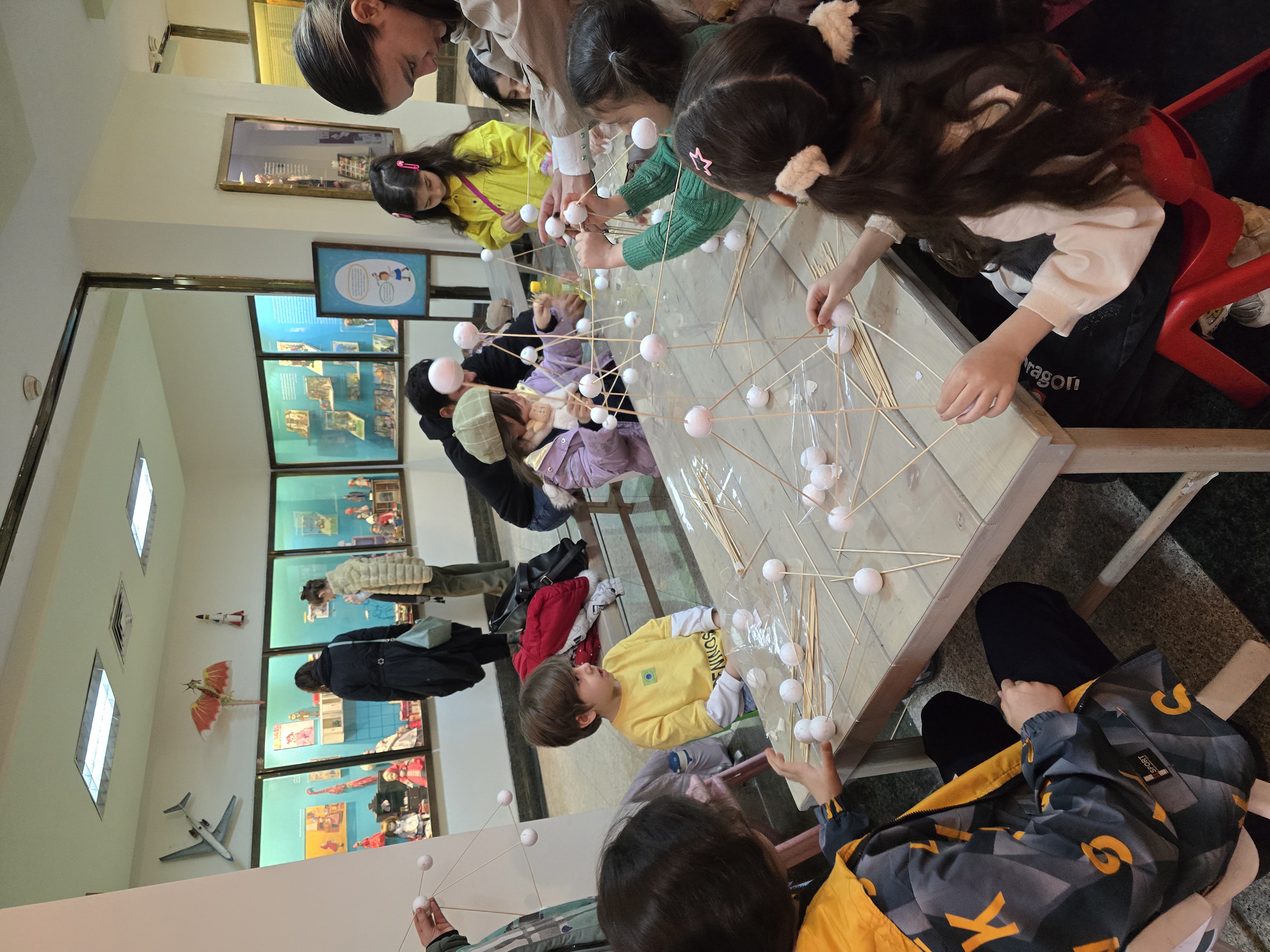 در این کارگاه به دنبال آشنایی کودکان و نوجوانان با اشکال هندسی هستیم. با آنها از نقطه، خط و سطح صحبت می‌کنیم. در ادامه به همراه یکدیگر در موزه قدم می‌زنیم و درباره اشکال مختلفی که می‌بینیم و اجزای تشکیل‌دهنده آن‌ها گفتگو می‌کنیم. در ادامه با کمک گوی‌های یونولیتی و میله‌های چوبی کودکان و نوجوانان این فرصت را می‌یابند که با نقطه و خط به ساخت اشکال هندسی مختلف بپردازند. دست‌ساخت آن‌ها در کنار هم چیدمانی را شکل می‌دهد که کودکان و نوجوانان می‌توانند از طریق آن تجربه‌ی فضایی به دست آورند. این نوع کارگاه‌ها فرصتی برای تعامل و ارتباط بیشتر کودکان و نوجوانان بایکدیگر و همچنین با والدینشان است به‌طوریکه می‌تواند به تجربه‌ی بازی گروهی تبدیل شود. تجربه این مفاهیم از طریق ساخت ماکت قابل گسترش هم امکان‌پذیر است که در دست‌ورزی و پرورش تجسم فضایی کودکان موثر است.