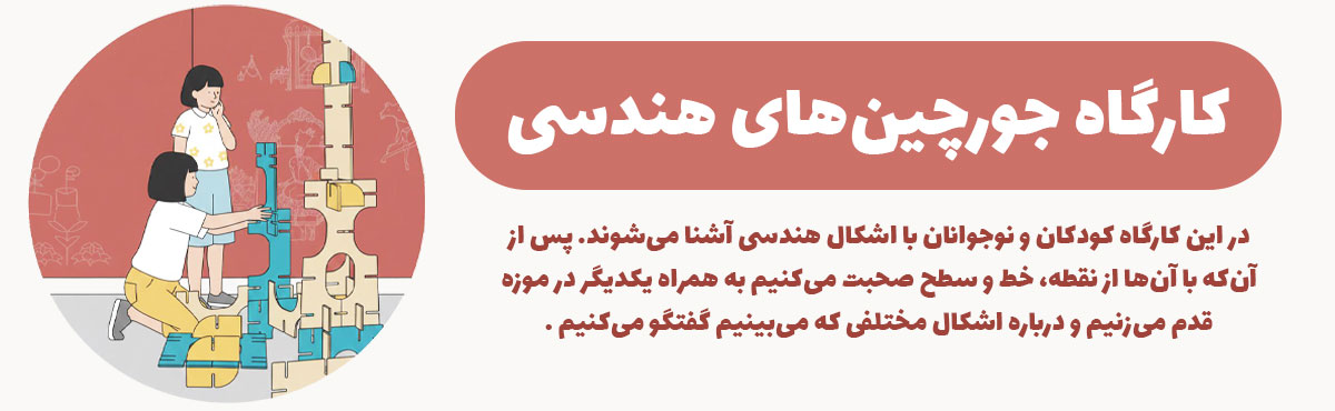 در این کارگاه کودکان و نوجوانان با اشکال هندسی آشنا میشوند. پس از آنکه با آنها از نقطه، خط و سطح صحبت میکنیم به همراه یکدیگر در موزه قدم میزنیم و درباره اشکال مختلفی که میبینیم گفتگو میکنیم و نقطه، خط و سطح را در اشیای موجود در موزه پیدا میکنیم. در ادامه با کمک قطعات چوبی که با توجه به شکلهای موجود در معماری ایرانی ساخته شدهاند، کودکان و نوجوانان این فرصت را مییابند که با صفحات چوبی مختلف به ساخت اشکال هندسی متنوع بپردازند.