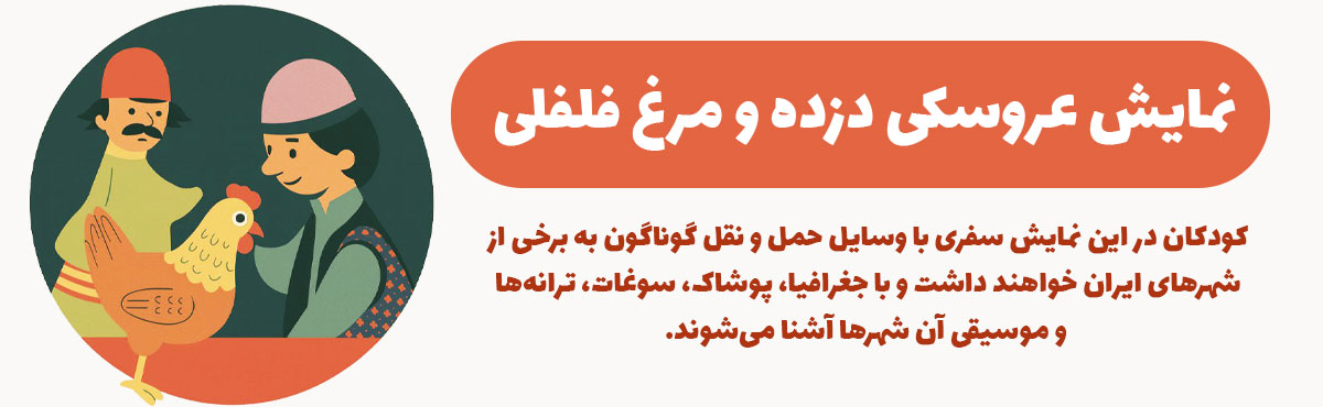 نمایش عروسکی دزده و مرغ فلفلی؛ داستانی شیرین و خاطرهانگیز از سفر فلفلی در شهرهای مختلف، آشنایی با مکان های دیدنی، سوغاتی شهرها و گویش ها برای پیدا کردن مرغش و ماجراهایی شنیدنی در مسیر این جستوجو.