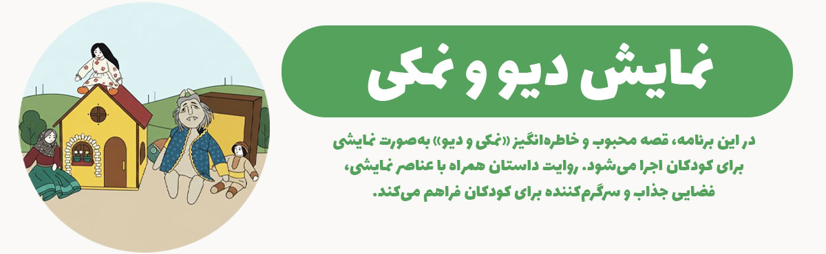 در این برنامه، قصه‌ محبوب و خاطره‌انگیز «نمکی و دیو» به‌صورت نمایشی برای کودکان اجرا می‌شود. روایت داستان همراه با عناصر نمایشی، فضایی جذاب و سرگرم‌کننده برای کودکان فراهم می‌کند.