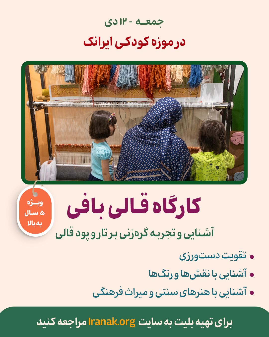 در این کارگاه، کودکان بهصورت عملی گرهزنی بر تار و پود قالی را تجربه میکنند و با نقشها و رنگهای قالی ایرانی آشنا میشوند. این برنامه با هدف تقویت مهارتهای دستورزی و آشنایی با هنرهای سنتی و میراث فرهنگی طراحی شده و زیر نظر استادکار برگزار میشود.